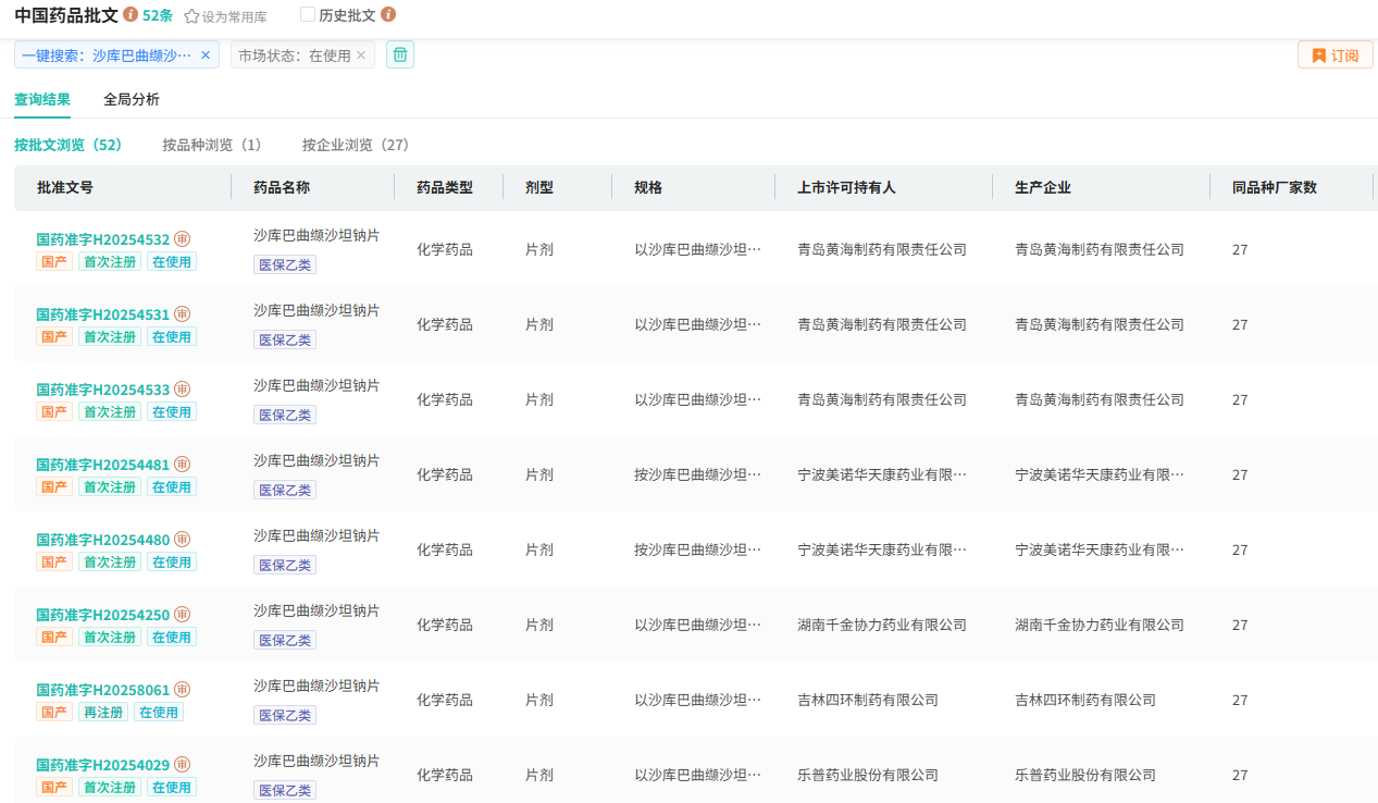 据摩熵医药数据库显示,目前沙库巴曲缬沙坦钠片有27家企业的52个生产批文在使用中,26家企业过评,其中不乏科伦药业、倍特药业、正大天晴、齐鲁制药、石药集团等多家明星药企。