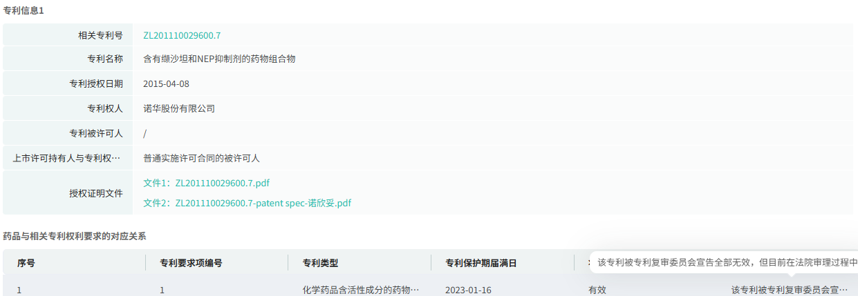 在专利布局上,诺华针对沙库巴曲缬沙坦,在中国上市药品专利信息登记平台登记了3件专利,受到众多仿制药企的专利挑战。