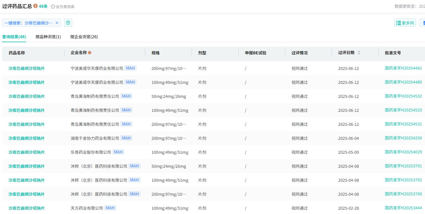 作为该市场的TOP1产品,沙库巴曲缬沙坦钠片吸引多家本土药企争相布局。