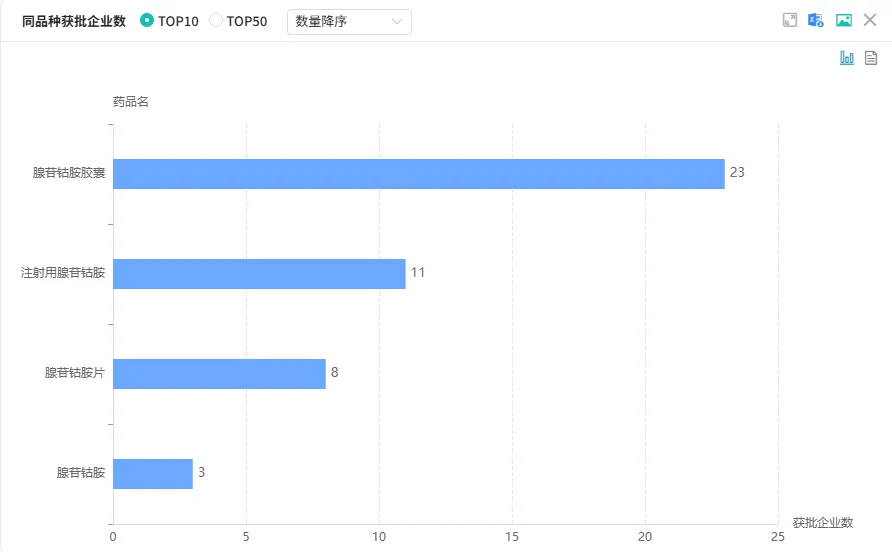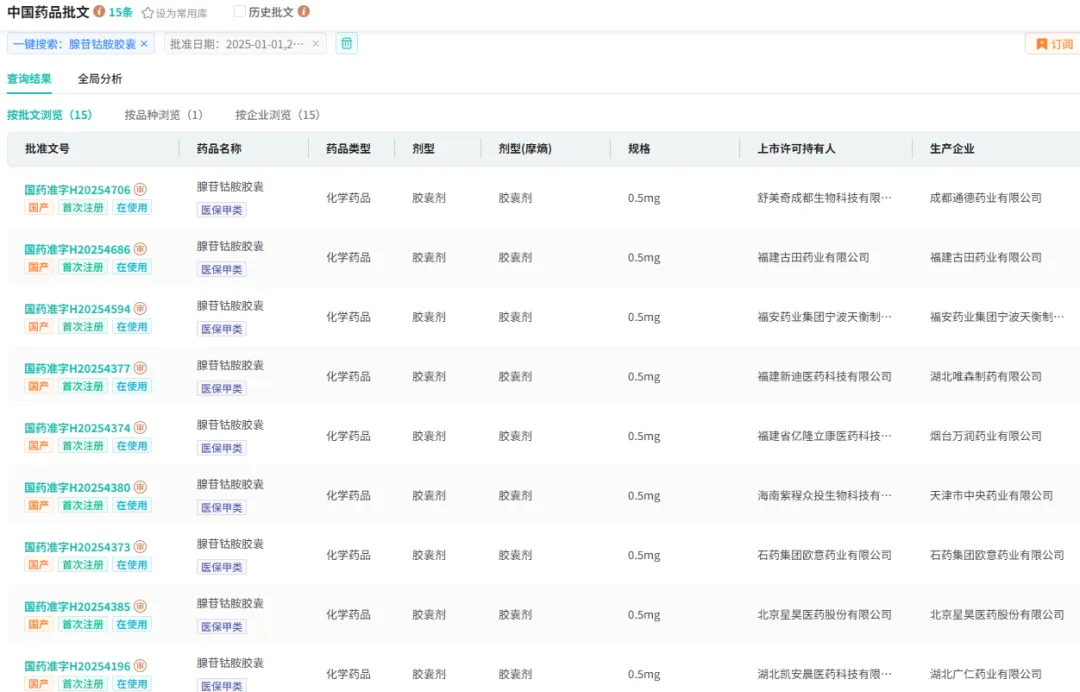 当前已有石药集团、山东鲁抗医药、湖南九典制药、杭州康恩贝制药、山东新华制药等23家药企获得腺苷钴胺胶囊生产批文。值得注意的是,仅今年就有15家企业密集获批,短期内获批数量占总量超六成,足见这一品种在市场中的关注度与企业布局的迫切性。