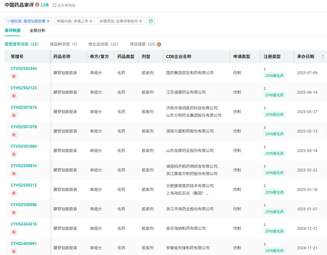国药集团、华海药业、山东益康药业、南京海纳制药、华北制药等32家企业报产在审,竞争热度持续攀升。随着腺苷钴胺胶囊不断布局,将为更多因维生素B12缺乏而苦恼的人群带来新的希望。