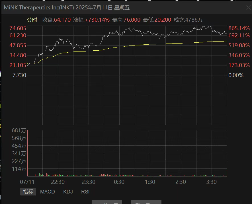 受此消息影响,MiNK Therapeutics股价暴涨730%,收盘股价为64.17美元/股。