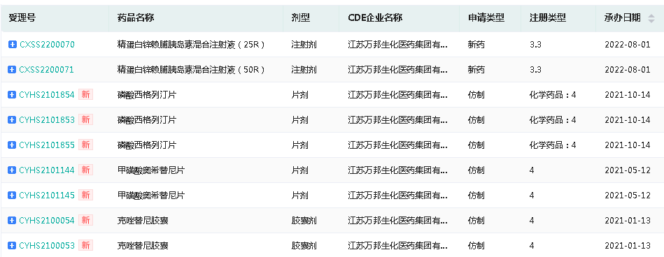 经药融云查询,江苏万邦生化还有2款糖尿病治疗药物已申报上市,目前正在审评审批中,分别为3.3类新药精蛋白锌赖脯胰岛素混合注射液(25R)和4类仿制化药磷酸西格列汀片。