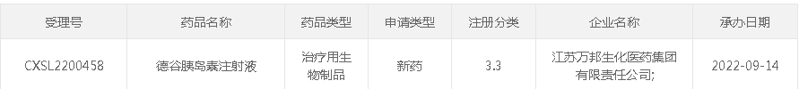 9月14日,CDE官网显示,江苏万邦生化医药集团的递交的3.3类生物药德谷胰岛素注射液临床试验申请获受理。目前国内尚无该9亿重磅降糖药的生物类似药上市。