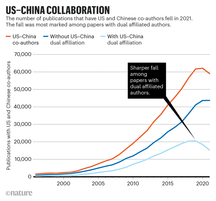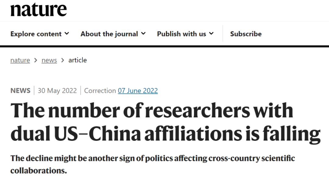 尽管科研人员总是希望“科学归科学”,但此类情况并不是第一次,也不会是最后一次。在2022年5月30日《Nature》上发表的一篇文章《拥有中美双重关系的研究人员数量正在下降》[1]显示,在过去3年中,在中国和美国宣布从属关系的学者人数下降了20%以上。这种衰退似乎是中美合作减弱模式的一部分,这种模式开始出现在研究数据库中。2021年,美国和中国这两个世界上最大的研究生产国的作者合作发表的论文数量也首次下降。