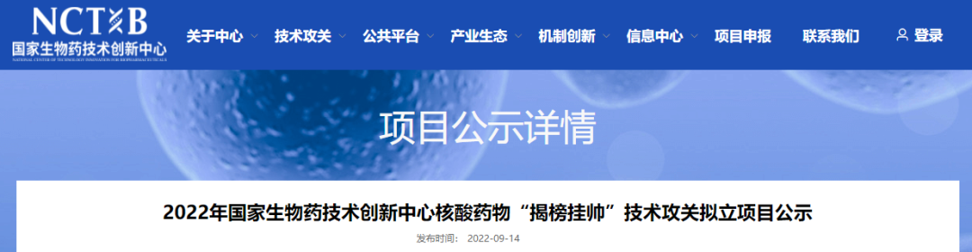 为解决制约我国核酸药物产业发展的关键核心技术问题,2022年3月,国家生物药技术创新中心发布了《核酸药物“揭榜挂帅”技术攻关项目指南》。经组织申报、专家评审、主管部门审议等立项程序,现将拟立项目共39项予以公示(见附件)。