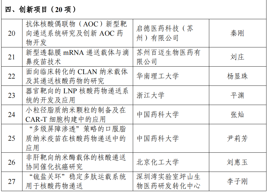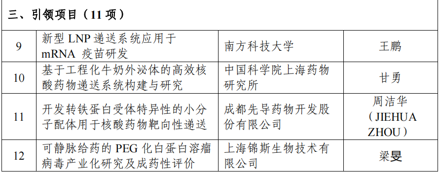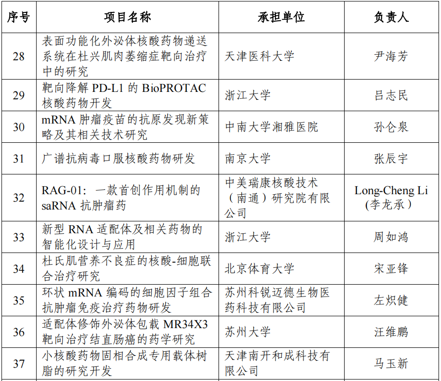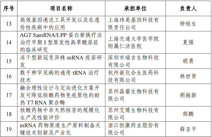 国家生物药技术创新中心发布2022年国家生物药技术创新中心核酸药物“揭榜挂帅”技术攻关拟立项目公示清单,其中多个企业、高校专家负责的项目入围: