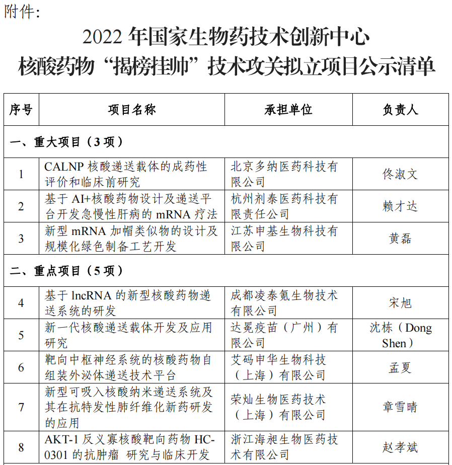 附件:2022年国家生物药技术创新中心核酸药物“揭榜挂帅”技术攻关拟立项目公示清单