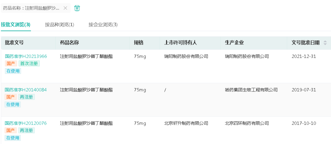 注射用盐酸罗沙替丁醋酸酯药品批文信息(微信搜索"药融云小程序"进行相关更多数据查询)