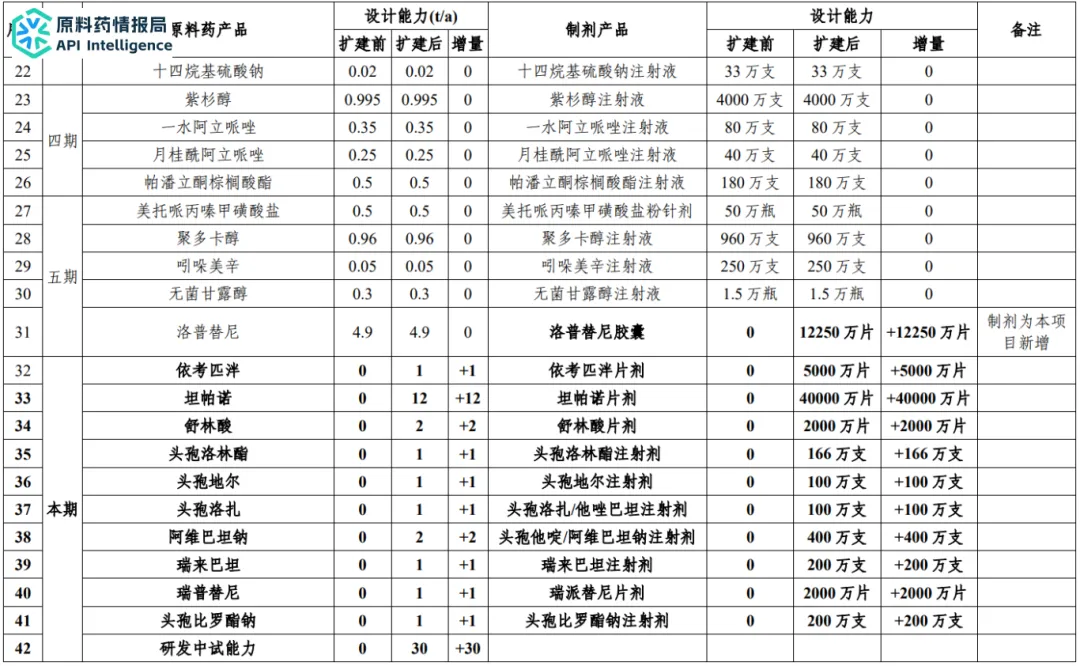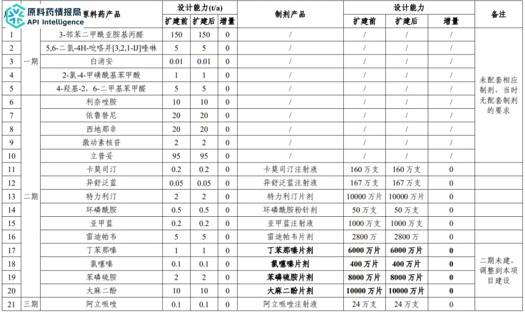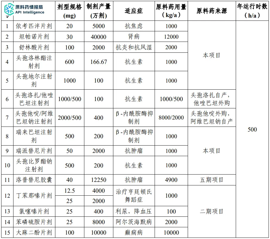 本项目为新增的10个原料药和五期项目原料药洛普替尼配套制剂,同时将二期项目丁苯那嗪、氯噻嗪、苯磷硫胺、大麻二酚制剂生产线转移至本项目制剂车间,形成片剂/胶囊剂8.565亿粒/年、注射剂1166万支/年的规模。