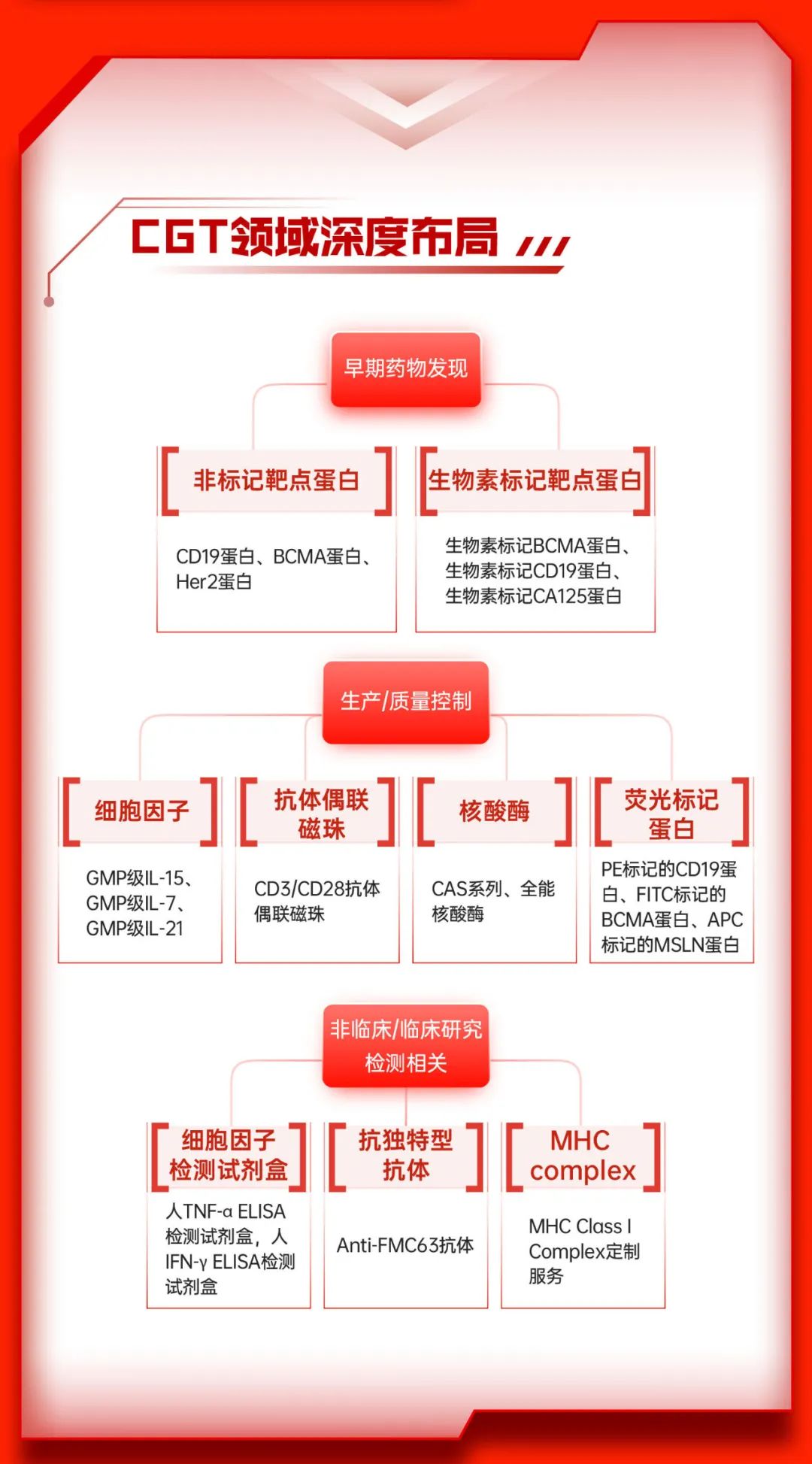 重组蛋白是运用基因工程和细胞工程等技术,获得的具有一定功能和活性的蛋白质。重组蛋白是生物药、细胞免疫治疗及诊断试剂研发和生产过程不可或缺的关键生物试剂。近年来,靶向治疗、免疫治疗逐步兴起,提升了肿瘤、自身免疫疾病、传染病等疾病的治疗效果。抗体药和以CAR-T为代表的细胞免疫治疗在靶向治疗、免疫治疗中扮演了核心角色,其研发和生产过程需要高质量的、高批间一致性的重组蛋白。百普赛斯依托自主研发的生物技术平台,开发了多种疾病靶点及生物标志物的重组蛋白,满足生物药研发和生产过程中不同环节对于重组蛋白的需求。
