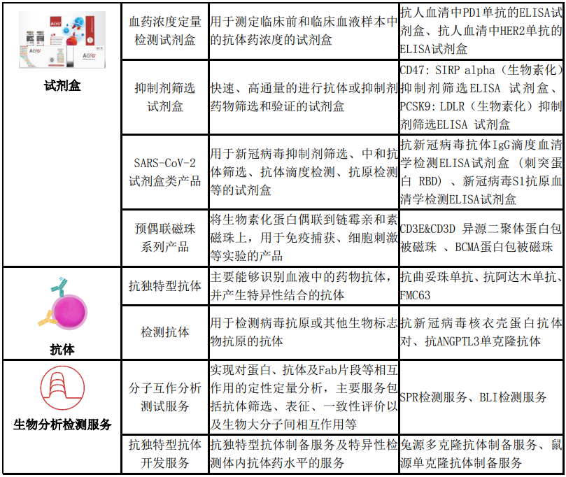 ①抗体:抗体是机体由于抗原的刺激而产生的具有保护作用的蛋白,可用于药物开发、生物学科研实验、诊断试剂开发、疾病治疗。公司开发了抗独特型抗体、SARS-CoV-2抗体等一系列抗体产品。②细胞因子:细胞因子是由免疫细胞和某些非免疫细胞经刺激而合成、分泌的一类具有在细胞间传递信息、具有免疫调节和效应功能的蛋白质或小分子多肽。公司开发了一系列如IL-15、IL-7等高质量的GMP级别细胞因子,可以更好助力免疫细胞治疗药物的临床研究。③试剂盒:百普赛斯研发了用于生物药研发过程中的检测试剂盒,包括血药浓度检测试剂盒、抑制剂筛选试剂盒。新型冠状病毒疫情爆发之后,公司研发了新型冠状病毒筛选试剂盒。