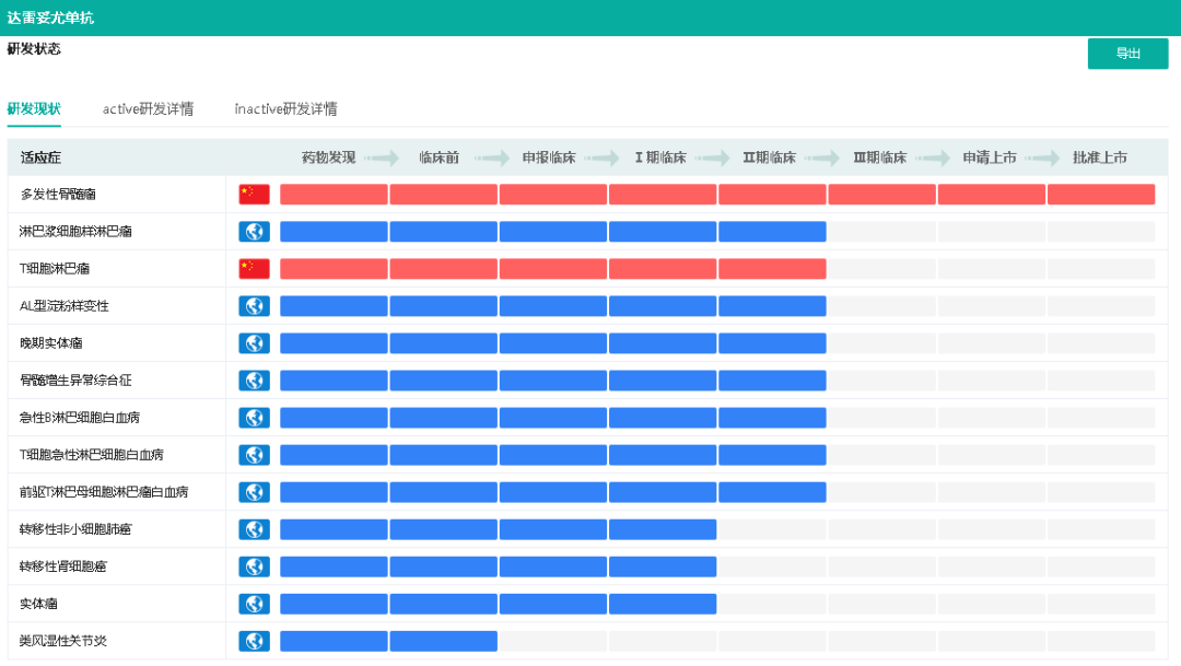 9月16日,据CDE官网,正大天晴的3.3类新药达雷妥尤单抗注射液临床申请获受理,是国内第2家申报该西安杨森制药$60亿单抗药物临床的药企。2021年1月,NMPA正式批准了复宏汉霖的达雷妥尤单抗生物类似药HLX15(重组抗CD38全人单克隆抗体注射液)的临床试验申请,用于多发性骨髓瘤(MM)的治疗。