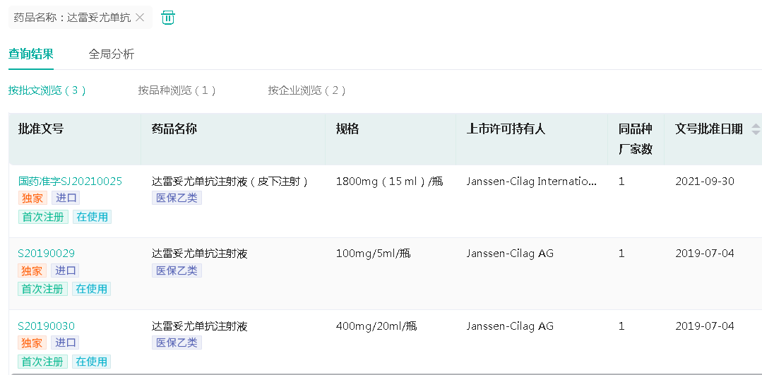 据药融云数据库显示,目前国内仅有原研西安杨森制药获批生产达雷妥尤单抗,有皮下注射剂和静脉注射剂两种。
