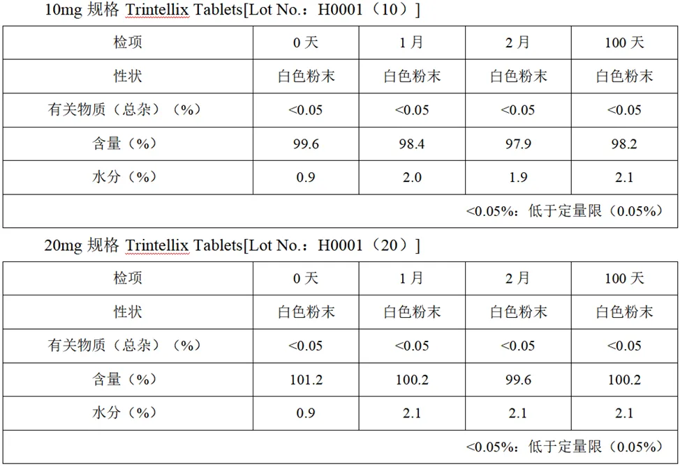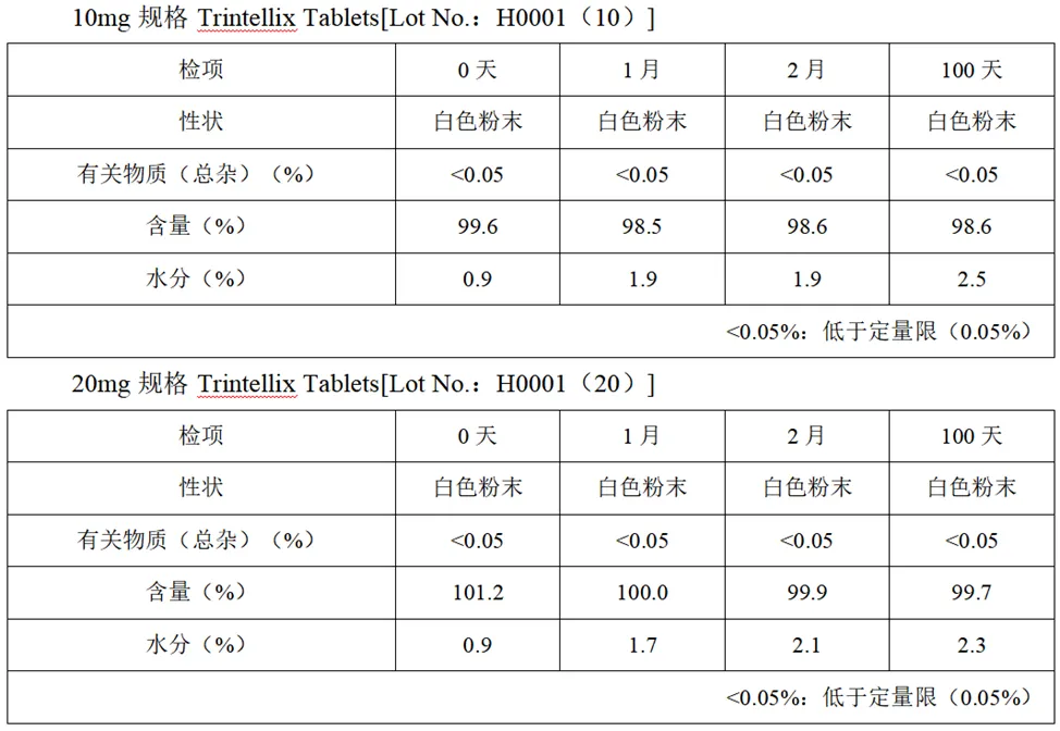 10mg、20mg规格Trintellix Tablets粉碎后储存条件:25℃/75%RH、内部散射光、玻璃容器、开盖和0℃、遮光、玻璃容器、密封,稳定性如下: