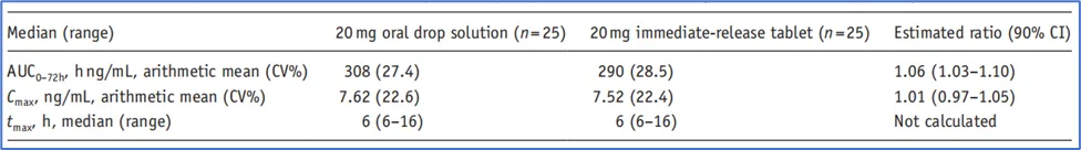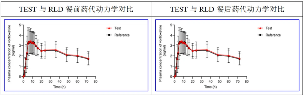 数据表明,伏硫西汀口服滴剂(溶液)与伏硫西汀速释片在英国人体内生物等效,可知制剂中辅料种类、用量不同不会影响伏硫西汀的药代动力学,两制剂的达峰时间均在6-16h小时,吸收速率相对于溶出速率比较缓慢。