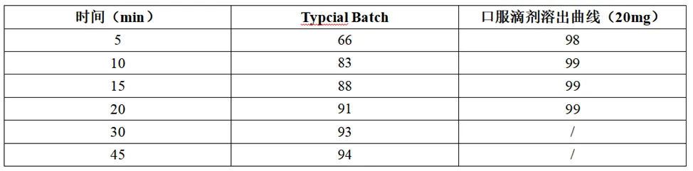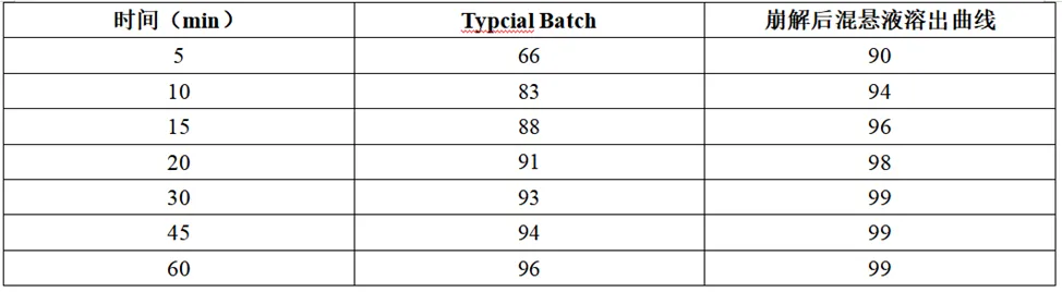 将崩解后的混悬液全量转移至溶出杯中,考察了混悬液的溶出曲线(0.1N HCl),结果见下表。
