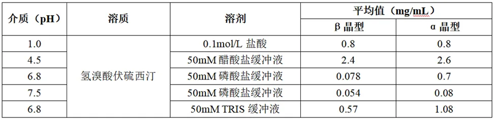氢溴酸伏硫西汀参比制剂中所用原料药的晶型为β晶型,其晶型专利将与2027年到期,为规避专利提前上市,有些企业可能采用的α晶型的原料药进行产品开发,因此需要评估不同晶型的原料药的体外溶解度、溶解速率差异及自制产品的溶出差异。由数据(下表)可知,α晶型和β晶型的伏硫西汀体外溶解度没有差异。
