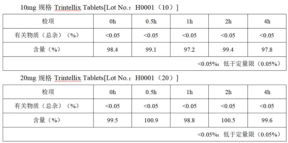 混悬条件:将1片10mg或20mg的Trintellix Tablets置于20mL55℃的热水中,37℃条件下静置。5分钟和10分钟后,轻摇并观察崩解情况,然后将混悬液置于25℃条件下储存。