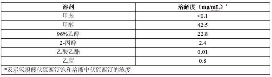 氢溴酸伏硫西汀在各有机溶剂中的溶解度(约22℃)如下:
