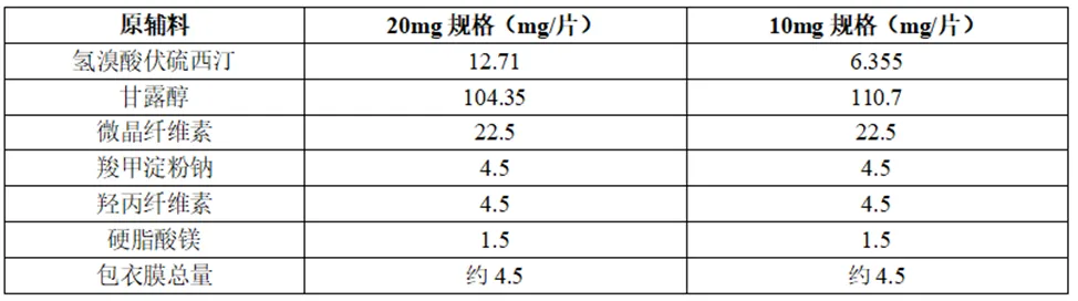 伏硫西汀片参比制剂公开的处方组成及石药中奇专利中公布的处方一致,具体见下表: