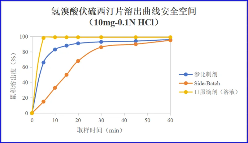 基于对药动学、片剂崩解后溶出曲线、口服滴液的溶出曲线及溶出度Q值制定与体内BE的研究结果进行讨论和分析,确定了氢溴酸伏硫西汀片溶出曲线的安全空间。具体空间见下图,安全区间为口服滴剂和Side-Batch溶出曲线之间的区域。