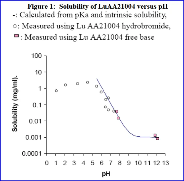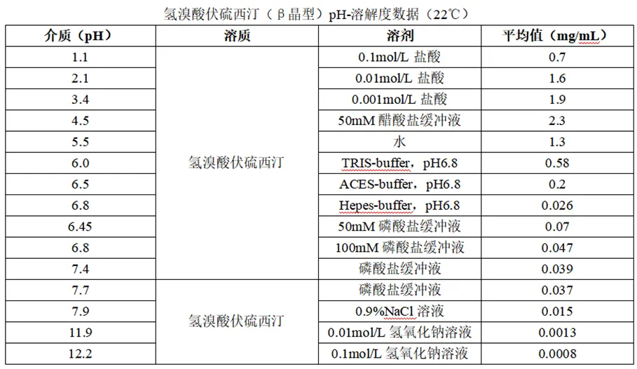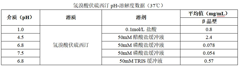 β晶型氢溴酸伏硫西汀在22℃溶剂中的溶解度表明氢溴酸伏硫西汀的pH-溶解度具有明显的pH依赖性(其饱和水溶液pH值约为5.5)。在酸性介质中溶解度较高,pH≤5.5时其溶解度无明显差异。原料药的粒径对药物的溶出速率有影响,经过研究申报人将原料药的粒径(D50)定为30-120μm,在该粒径范围内,未发现粒径对样品关键性质产生影响。