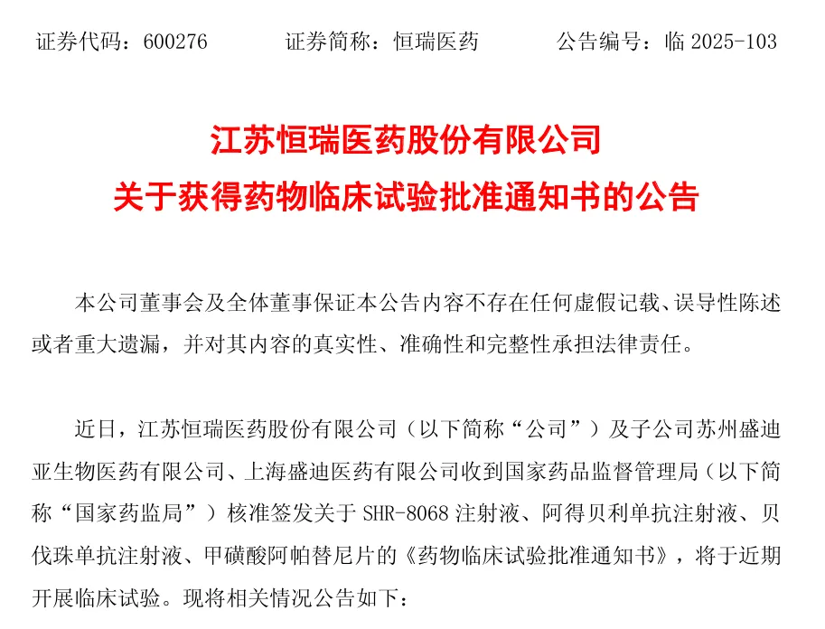 7月17日,恒瑞医药发布公告,公司收到国家药品监督管理局核准签发关于SHR-8068注射液、阿得贝利单抗注射液、贝伐珠单抗注射液和甲磺酸阿帕替尼片的《药物临床试验批准通知书》,将于近期开展临床试验。