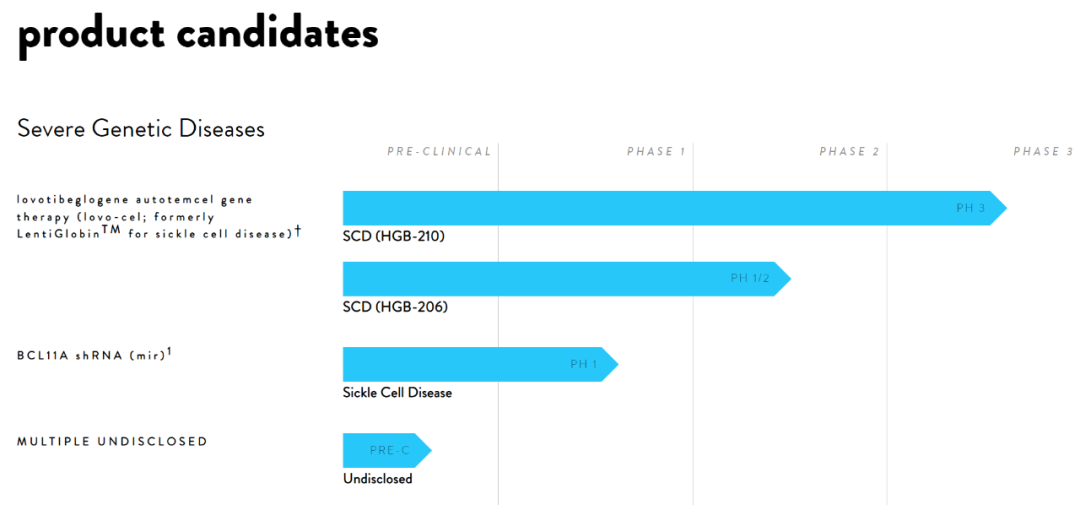 注:† lovo-cel临床项目目前处于部分临床搁置状态,该项目涉及一名患有持续性非输血依赖性贫血的青少年患者(18岁以下),蓝鸟生物公司将继续与FDA合作解决部分搁置问题。