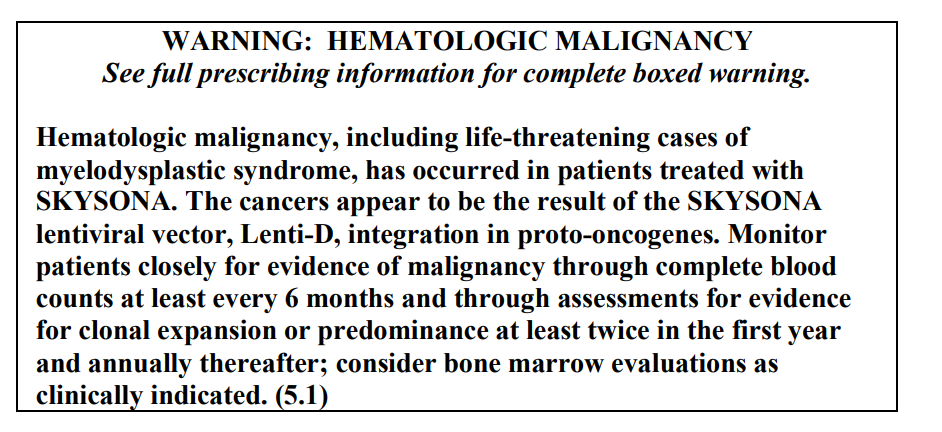 美国FDA的批准附带了关于血癌风险的警告,以及需要每半年和每年进行一次测试来检测癌症的早期迹象;同时,蓝鸟生物在患者在接受治疗后,必须继续跟踪患者15年,以收集有关其长期安全性和有效性的数据。