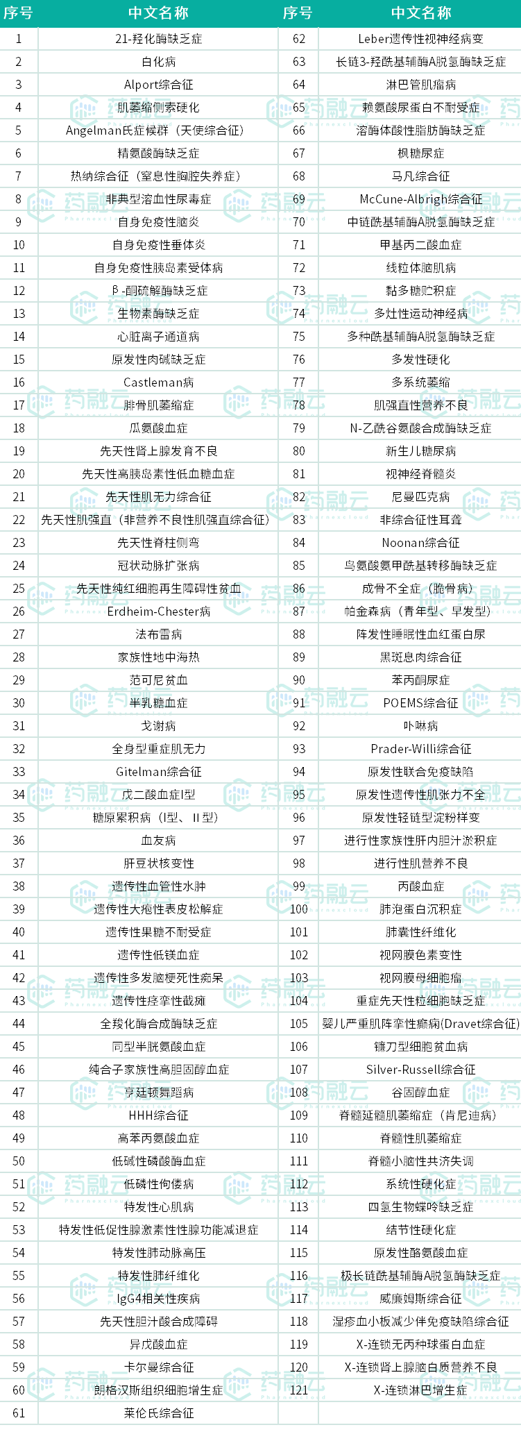 2018年5月,国家卫生健康委员会等五部门联合制定了《第一批罕见病目录》,公布了121种罕见病,包括21-羟化酶缺乏症、白化病、血友病等等。