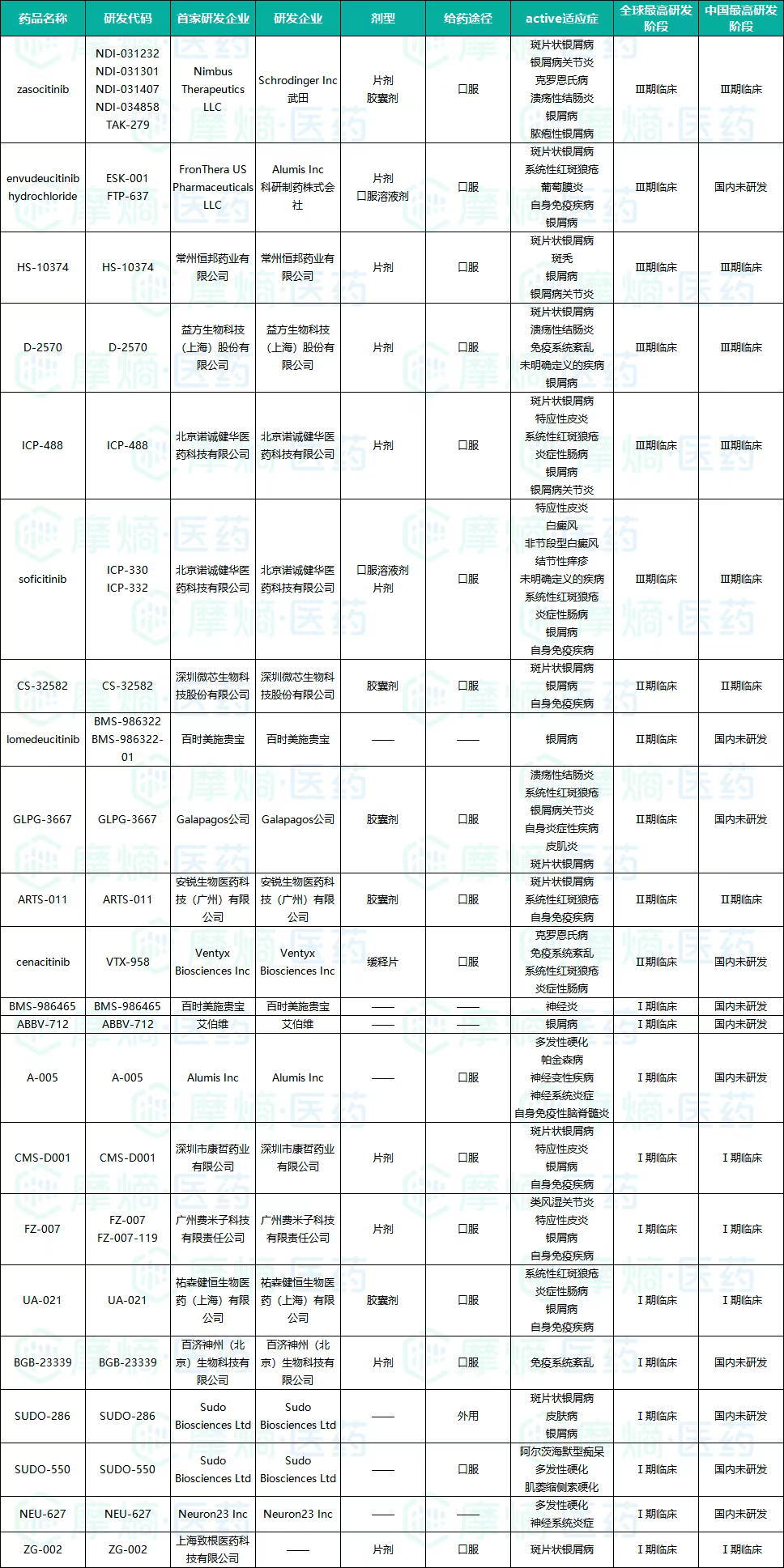 (1)快速覆盖成熟靶点:JAK、CD19、IL-17、TNF-α、PDE4等,适应症扩展至银屑病、特应性皮炎、慢阻肺(COPD);