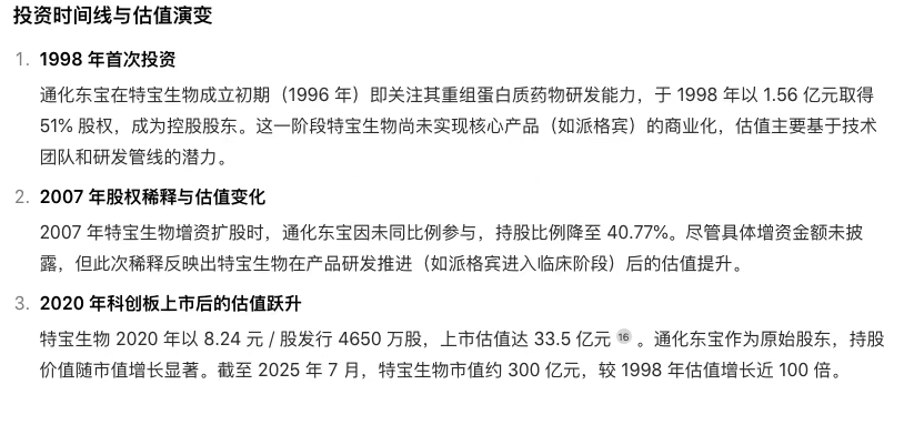 2025年7月3日,通化东宝取得协议转让特宝生物部分股权过户登记确认书,转让价款总额为13.01亿元。最早投资于1998年,累计减持套现可能超25亿。(下图含时间线)