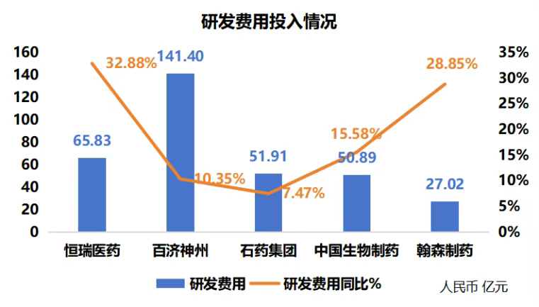 翰森研发费用投入27.02亿但其同比增速28.85%,增速仅次于恒瑞,体现出“小而精”的投入策略。