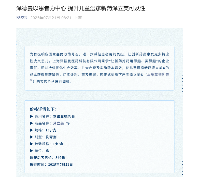 7月21日,上海泽德曼医药科技有限公司正式宣布,即日起将旗下全球首款非激素类AhR靶点特应性皮炎(湿疹)创新药——本维莫德乳膏(泽立美®)15g装零售价格从980元/支调整至360元/支,降幅达63.2%,为数百万特应性皮炎患儿及家庭带来重大利好。