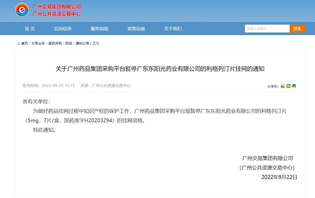 2022年9月22日,广州公共资源交易中心发布了一则通知,为做好药品挂网过程中知识产权的保护工作,广州药品集团采购平台现暂停广东东阳光药业有限公司的重磅首仿降糖药——利格列汀片(5mg,7片/盒,国药准字H20203294)的挂网资格。