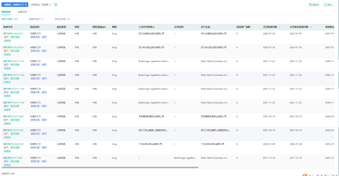 根据药融云中国药品批文最新数据显示,目前国内已经有6家公司获得利格列汀片的药品批文,分别是原研勃林格殷格翰,首仿企业广东东阳光,扬子江药业,石药集团,科伦药业和华海药业(国产企业获得生产批文且视同通过一致性评价)。从药融云招投标数据库和医院销售数据库显示,当前在国内销售记录的仅有勃林格殷格翰和广东东阳光。