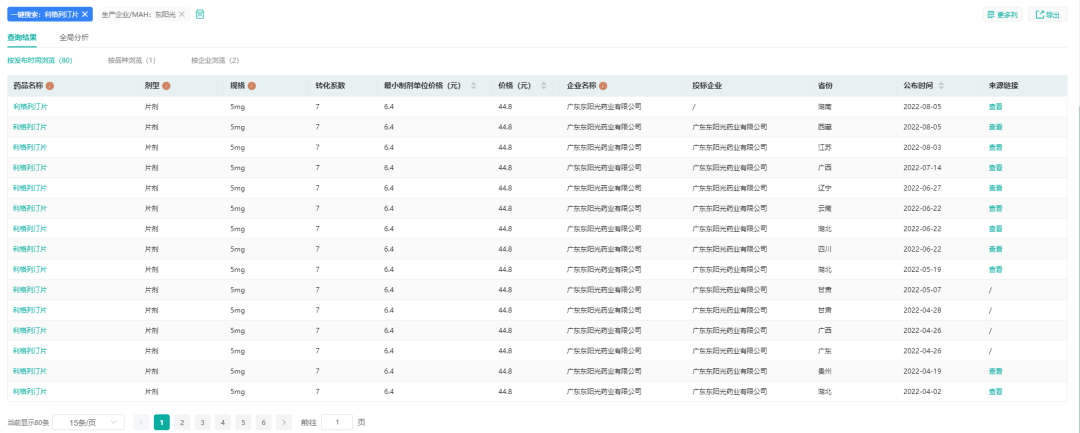 根据药融云企业版药品招投标数据库最新数据显示,自2021年2月开始,广东东阳光利格列汀片已经在海南、甘肃、江苏、广西、四川等多个省份挂网,挂网价为44.8元/盒。