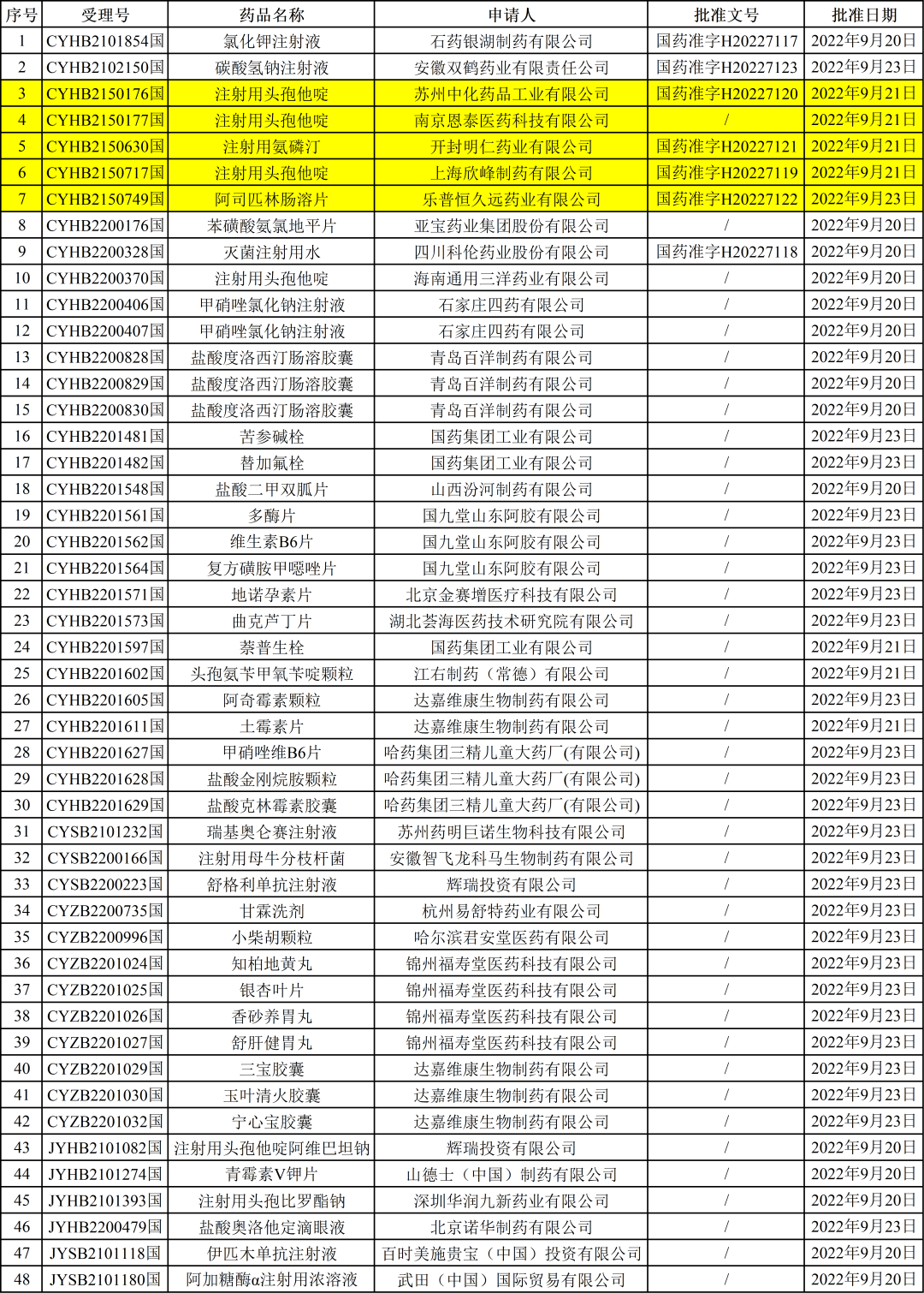 NMPA发布2022年09月27日药品批准证明文件待领取信息,共有48个受理号获批,其中5个为一致性评价受理号,分别为: