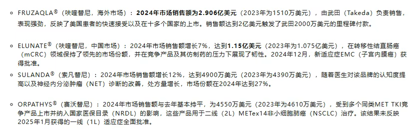 作为和黄医药最具竞争力的核心产品,呋喹替尼2024年的市场表现可圈可点。国内市场销售额为1.15亿美元,同比增长7%。海外市场销售额为2.906亿美元,可谓大放异彩。
