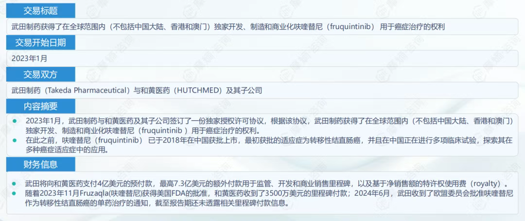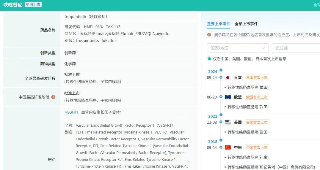 2023年1月,和黄医药将呋喹替尼海外权益以4亿美元首付款授权给日本药企武田,创下了国产小分子药物授权的最高纪录。目前其已成功出海美国、欧盟和日本三大全球主流药物市场,海外商品名为FRUZAQLA。