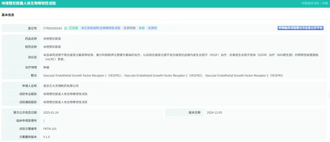 值得关注的是,正大天晴的BE实验已于5月21日宣告完成,这为其申报呋喹替尼仿制药上市创造了关键契机,成为推动其进入仿制药市场竞争的关键节点。