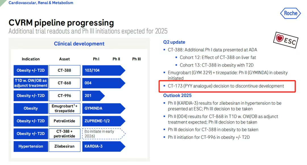 罗氏还终止了其27亿美元收购Carmot Therapeutics所得肥胖症资产CT-173的开发。CT-173是一种长效PYY类似物,罗氏原计划在今年启动I期临床试验。