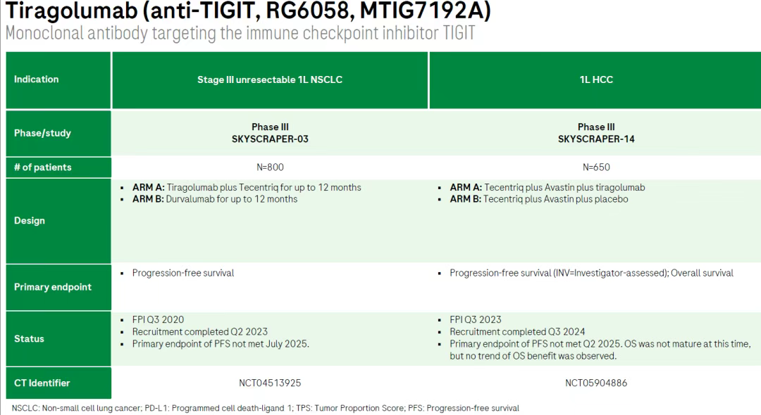 值得注意的是,TIGIT单抗RG6058(tiragolumab)仅剩的两项III期临床都被终止了,分别是:(1)联合Tecentriq用于一线治疗不可切除的III期非小细胞肺癌,该研究于今年7月未达到PFS主要终点;(2)联合Tecentriq和Avastin用于一线治疗肝细胞癌,该研究于今年二季度未达到PFS主要终点。