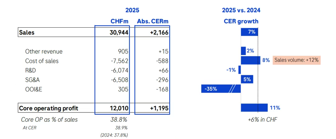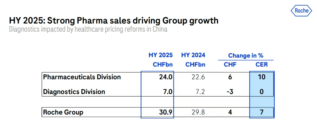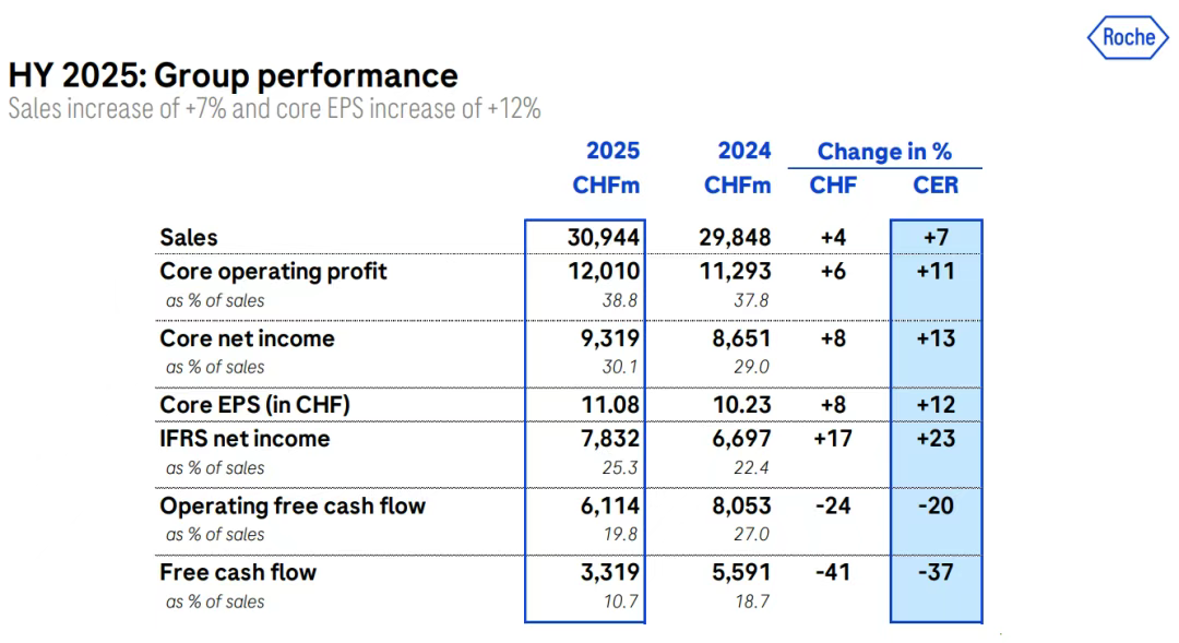 罗氏上半年总营收309.44亿瑞士法郎(约为389.82亿美元,按汇率1 瑞士法郎≈1.2598 美元),同比增长7%(按固定汇率CER计算,下同);净收入93.19亿瑞士法郎(117.44亿美元),同比增长13%。