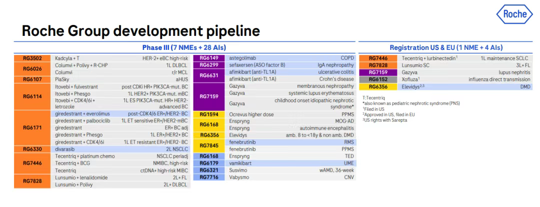 根据最新管线更新情况,罗氏有68个新分子实体(NMEs)和总共115个项目,其研发管线前景广阔。根据令人鼓舞的数据,公司将四种疗法推进到临床开发的最后阶段:用于治疗血友病 A的 NXT007、用于治疗阿尔茨海默病的trontinemab、用于治疗早期帕金森病的prasinezumab 和 新型抗生素zosurabalpin,zosurabalpin 有望成为50多年来首个针对对大多数其他治疗方法产生耐药性的细菌类型的药物。