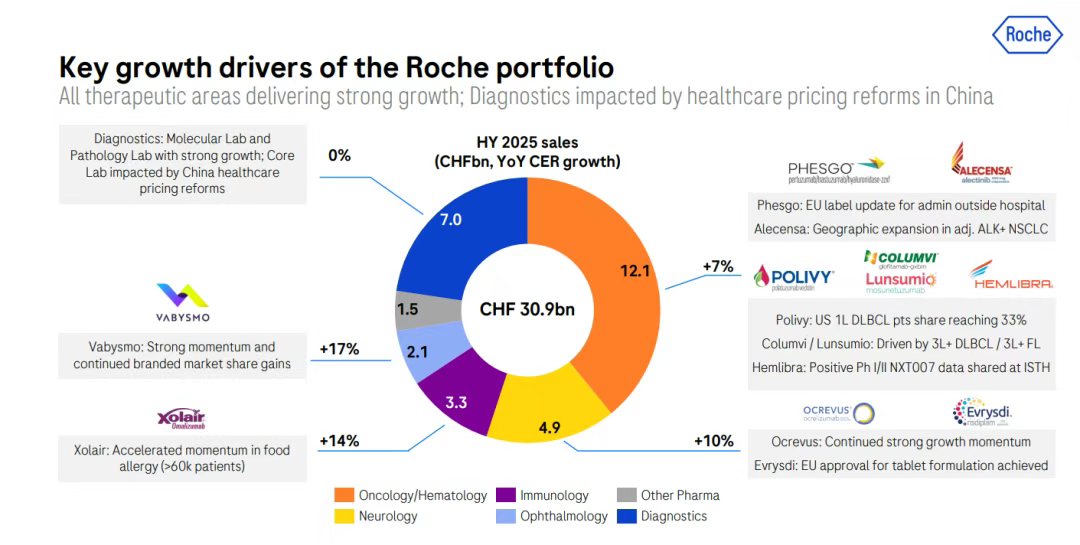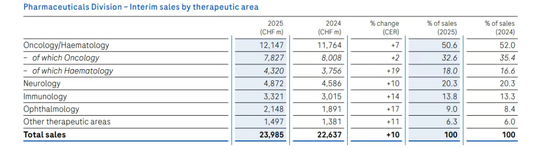 罗氏的制药业务由针对肿瘤、血液疾病、神经系统疾病、免疫疾病、眼科疾病5大领域的特色管线组成,2025 H1肿瘤领域收入78.27亿瑞士法郎(98.55亿美元,+2%),血液领域收入43.2亿瑞士法郎(54.39亿美元,+19%),神经领域收入48.72亿瑞士法郎(61.34亿美元,+10%),免疫领域收入33.21亿瑞士法郎(41.81亿美元,+14%),眼科领域收入21.48亿瑞士法郎(27.02亿美元,+17%)。
