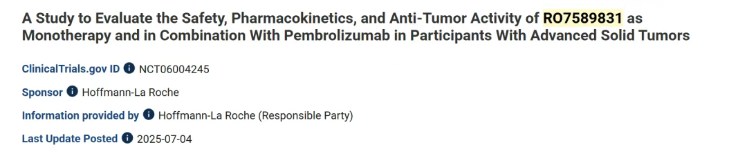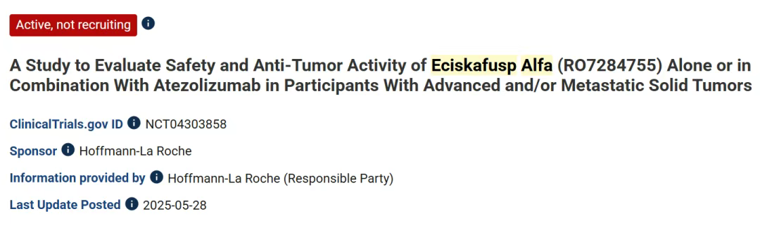 (1)PD-1-IL-2v抗体融合蛋白RG6279(eciskafusp alfa)联合Tecentriq治疗实体瘤的I期临床试验(NCT04303858)。