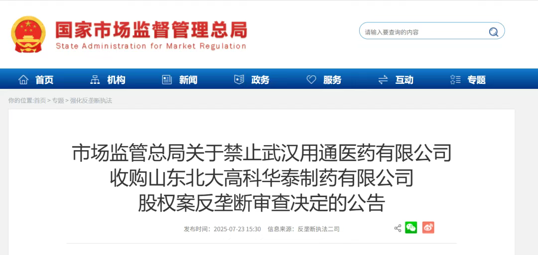 7月23日,国家市场监管总局正式公告,禁止武汉用通医药有限公司收购山东北大高科华泰制药有限公司股权。这一决定在医药圈投下一枚深水炸弹——未达申报标准的交易,竟被追溯审查并强制拆分!