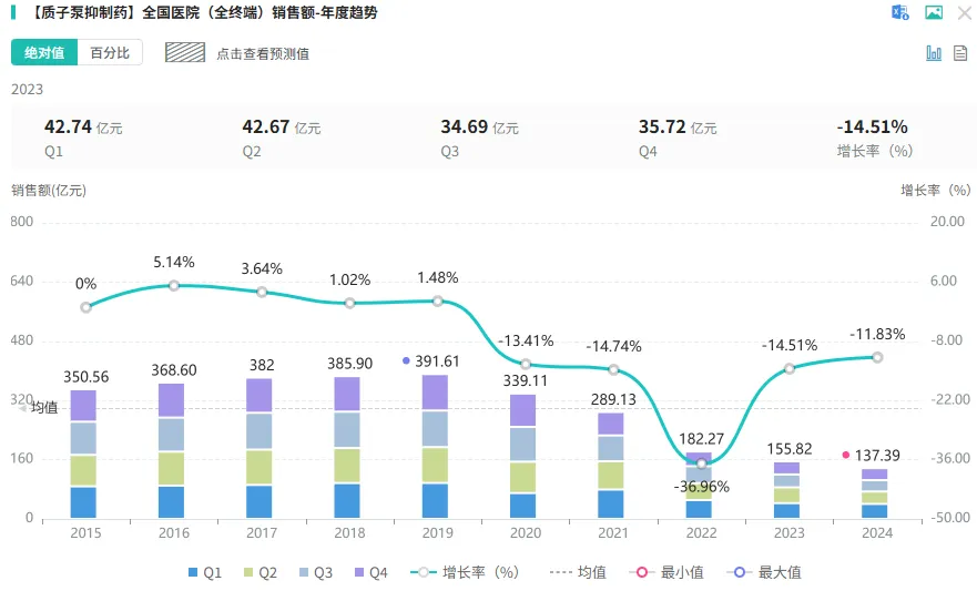 质子泵抑制剂一直以来主导着抑酸药物市场,24年院内市场份额为137.39亿元。目前国内已上市药物包括奥美拉唑、艾司奥美拉唑、泮托拉唑、艾普拉唑、雷贝拉唑、兰索拉唑等。由于用药人群庞大,国内药企纷纷布局。